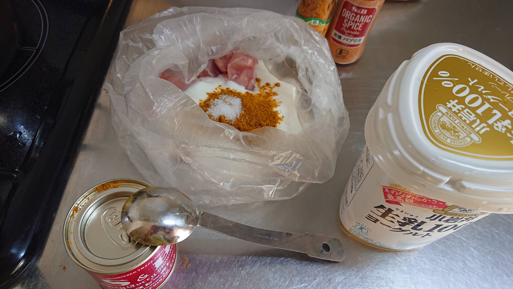 ④ビニール袋に鶏肉,ヨーグルト,カレー粉,塩を入れてもんでおきます。