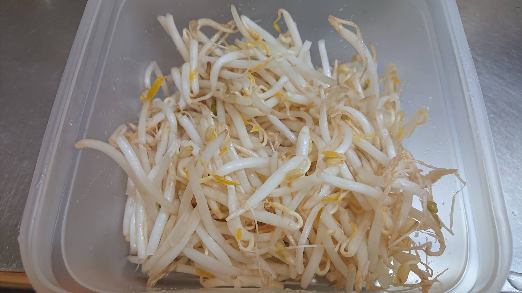 私は手を洗ってキッチンペーパーでもやしを抑えながら,シンクに水をだばーってする。