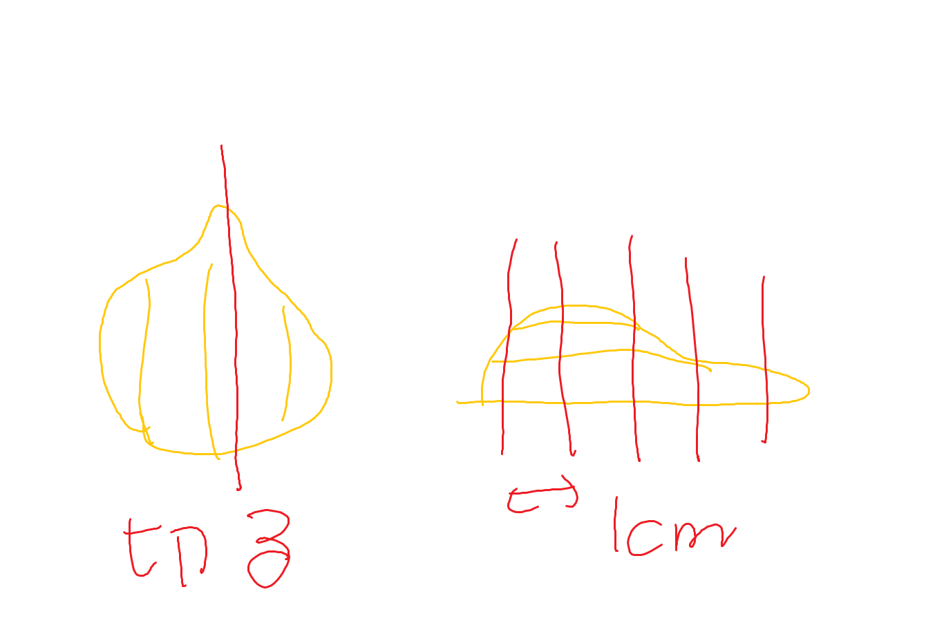 玉ねぎはどうせ煮込んで溶けるので炒められる程度ということで繊維を切るようにやっぱり1センチ刻みぐらいで切ります。