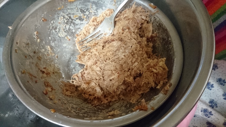 フードプロセッサーなんてものはないのでフォークでザクザクとつぶしていきます。